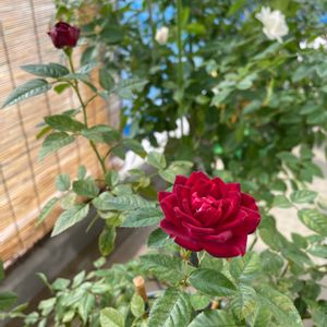 10/21 深紅のバラ、「いっちょう」(鉢の名前)が咲きました😍 花屋の店先で一目ボレしてから、1年になろうとしてます💕いつもは複数の花が咲きますが、今回はベーサルシュートの枝から1輪、咲きました😍