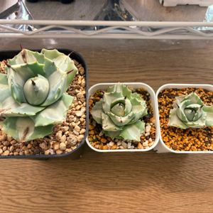🌼 アガベ植え替え 🌼 「笹の雪」と「ドラゴントゥース」を植え替え🌟鉢も引っ越して気分転換⤴︎🎶 瀕死の「スーパークラウン」、小さい鉢に移してあげようと思ったら、プチッ😱…。根元を折ってしまいました...(lll-ω-)チーン。ルートン付けたけど、発根してくれるかな〜😥💦 「ムルティフィリフェラ」は去年 植えたので この春は植え替えしないけど、なんか少し色が悪くなった気がして心配🥺。