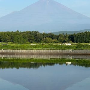 夏の逆さ富士と、阿多野の貯水池 (2023.7.18 6:05 小山町阿多野の貯水池より)