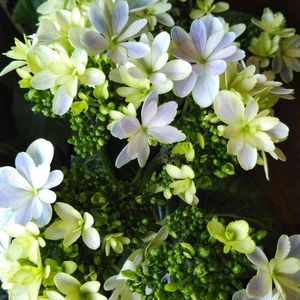 アジサイ 「凛」 加茂セレクション最新品種のこの子は 蕾が上がって来た日からずっと 陽当たり良好過ぎる畑の ド真ん中においてありました。 結論。 「凛」は「こんぺいとう」と同じ 紫外線をたっぷり当てないと 覆輪がはっきり出てこない子です。 独断と偏見に充ちた結論だけど(*^^*)
