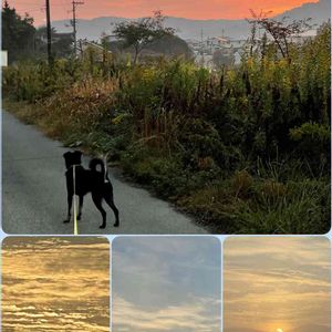 今朝の日の出。🌄 上、下左、真ん中、右の順で、陽が昇って来ました。同じ空ですが、表情は全然違ってきます。 太陽が出た途端に朝霧が濃くなったので、とても幻想的な朝になりました。よしくんは何を見てるのかな。🐕🦺💨💨💨 ちょっといつもより大人に見えます。🐕🦺 セイタカアワダチソウは、まだまだ元気ですが、雑草さんたちは、冬の色になって来ました。 秋は静かにでも確かに深まりつつあります。