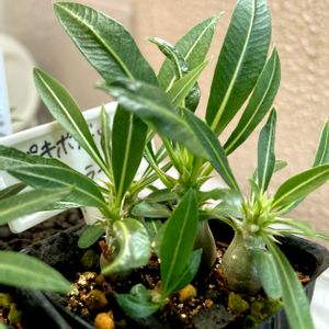 パキポディウム ロスラーツム 投稿が滞っておりましたが、GSから心が遠ざかっていた訳ではありません! ネタとヒマとカネが無かっただけです❗ (↑↑↑↑↑言い訳) ①2023年現在(夜間撮影☾⋆·̩͙⑅*) ②2017年お迎え当時🔰 マダガスカル島の塊根植物で、つい2~3日前まで夜も外に出しておりましたが、落葉どころか紅葉もせずに葉を茂らせています。 今もお出かけ~帰宅までは外です。 ;:((՞-﹏-՞));: 雨が降りそうな時だけ軒下へ退避❗ ずっと植え替えはせず、鉢もそのまま。 見比べると太ってきてるのが分かります❗ ( ¯ω¯ ) 塊根界隈では『太った・🐽・』は最大級の褒め言葉です❗ 健康的でイイのであります❗ ( × )タポンッ