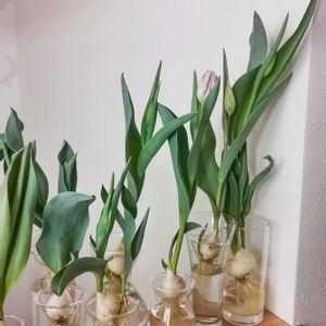 水栽培チューリップ 早咲きな子を1つの花器に ブラックヒーローが好きだなぁ 次はどの子が咲くかな?