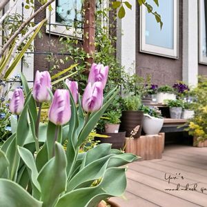 🏡My wood-deck garden✨ 𓈒𓏸◌🌷🌷🌷🌿✨✨ 𓈒𓏸◌ チューリップ"フレーミングフラッグ” アカシア"テレサ” 曇天の休日はまったりと𓂃 𓈒𓏸◌ 良い1日を〜🤗♪