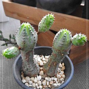 ユーフォルビアの交配種。形はオベサ見たいに丸くて、表面は蘇鉄キリンみたいにでこぼこ。成長期にちょろっと葉が出るけれど、すぐに落ちてしまう。……ネット検索の結果、鉄甲丸とオベサの交配種ではないかとにらんでいるんだけど、親株は仔吹きしているので、違うかなあ……とても好きな種類なんだけど、何しろ成長が遅い。8月の終わりで育てはじめて3年になるけど、じわっと一回り大きくなった程度。 世話の仕方が悪いのか、そういう種類なのか。仔吹きしてる親株と同じくらいの大きさだけど、仔吹きする様子もない。