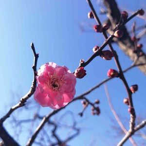 ご近所で毎年早咲きナンバーワンの紅梅です。 凛としてステキ♥️
