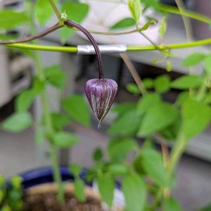 クレマチス 藤煤竹 壺型クレマチスです。 陽当たり最高の場所に鉢植えしているせいか、よく咲きます💠 真夏もちらほら咲いていた記憶が。花は小さめですが今もつぼみをあげてきていますね👑 左背後のトゲトゲボールは種。 今年のクレマチスで一番咲いたのはこの品種です😊