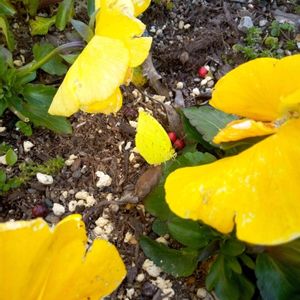 黄色いパンジーにまぎれて モンシロチョウがよわよわしく 隠れてました😹 そっと菜の花の大きな葉っぱで 簡易温室を🏘️ 早く元気になって、 自由に飛べますように🤗💞