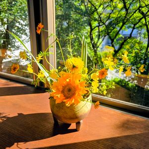 貴重な晴れ 午後の日差しとハロウィン🎃カラーの お花さん♡ 🌻ヒマワリはもう夏の花だけでは ないですね!