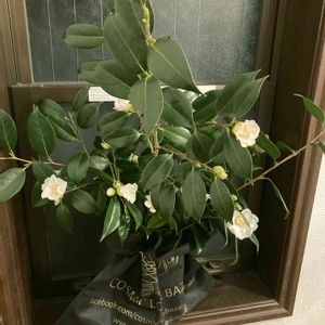 お隣のおばあちゃんに、白椿を枝ごともらった。 階段の踊り場の窓に飾ってみたよ💕 葉っぱもお花も綺麗だな😍