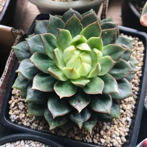 私の一番お気に入りの多肉ちゃん!🌱 中心から外にかけて緑のグラデーションがなんとも神秘的!!! 徒長も他の子達と比べてしづらくズボラな私でもなんとか綺麗なロゼットを保ってくれています😅 ずっと室内で日照不足だったので赤が少ないですが外に出してた子株たちは綺麗に紅葉してるのでまた親株も紅葉してきたらアップしたいと思います☺️ この子は何ヶ月か前に某ホームセンターで一目惚れして即お持ち帰りしました。 ですが、札を無くしてしまい名前が分からなくなってしまい…詳しい方自信なくても全然いので品種名教えて頂けると嬉しいです…😞