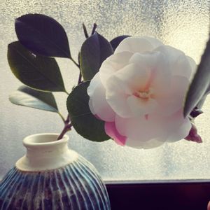 花瓶購入時に一緒にいただいた、蕾だった椿が咲きました。花びらが少しピンクで可愛らしいです。品種、なんなんだろう…