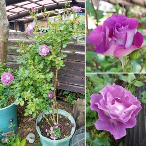 薔薇ブルーフォーユー 各枝が房でつぼみを持っています😃天花が次々開花中 だんだん青みがかって来ました😆 昨夏の移植でとても弱ってしまい、右側にあった一番太い枝が枯れたのでおかしな樹形になってます ちゃんとした鉢に植え直すとき治そう