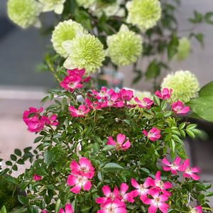 おはようございます☀ エントランスのミニバラさんたち フェアリーヒロロ💓とグリーンアイス🤍 ちょっとピークを過ぎたかな?! コラボの記念撮影ということで😉 皆さま今日もよい一日を🌹