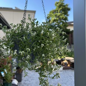 🤍✨ユーフォルビア ダイヤモンドスノー✨🤍 ハンギングでふんわりフワフワ🤍 ヘンリー蔦を這わせて💕 バックの💛のお花は 💛アンデスの乙女 可愛らしい響きのネーミング✨ 冬に低く✂️したら、 可愛く咲いている様子で 目の前で広がってます💕