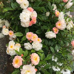 先程のアンジェラの隣にはサマースノーが満開に💕 花びらのウェーブが魅力的なツルバラです(^^)