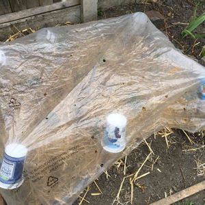 しばらくは好天気☀️続きでしたが、今日(イギリスはまだ火曜日です)から気温が下がり始め最高気温は10度、最低5度🥶。そのため種から育てた地植えのミニトマト🍅にビニールシートをかぶせました❗️ 剪定した木の枝を土に刺し、ビニールが破れないようプラスチック容器をかぶせ、端を石で固定✨。 何かを購入した時に商品が入ってた袋を切り広げて穴を開けたものですが、横幅がないので冷たい空気が入りそう😅 去年使用したのを取っておいたのですが今年も活躍してくれるかな❗️💫