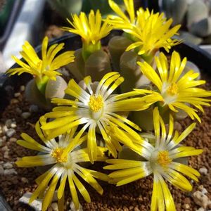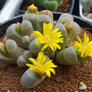 リトープスが花を咲かせました( ♥ᴗ♥ )今年の5月に郡仙園さんから来たのも咲いてる〜😊丈夫な苗だ👍隣のコノフィツム達も咲いてるよ🤗メセンは夫チョイスデス。