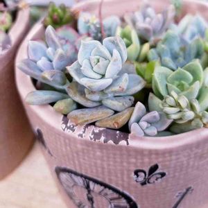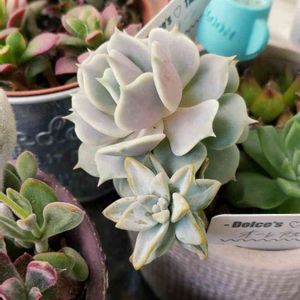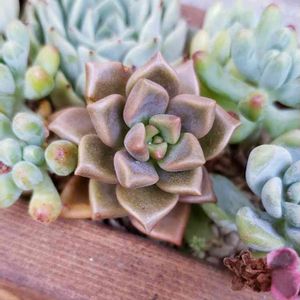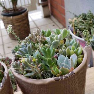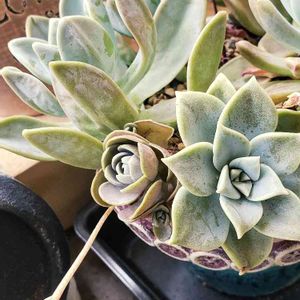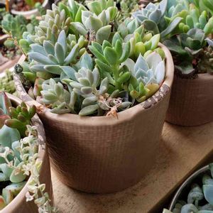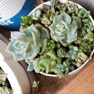 おはようございます😊 今日は今のところほどよい気温で🌥️です。夜からは雨になっちゃうみたいなので、帰宅時間が☔がかな。 いつも📷撮るとき、特に鉢とかは、それを移動させて背景とか…って考えて撮らないので、この寄せ植えも隅の方に置いてるから真上からです😅 大きめの子、バラ🌹みたいにかわいくなってきてました🎵 オシャレに考えて撮ればもっとかわいく見えるのにって思いながら、結構ざっくりな、てきとうなところとこだわっちゃうところの差がはげしいO型の私😆