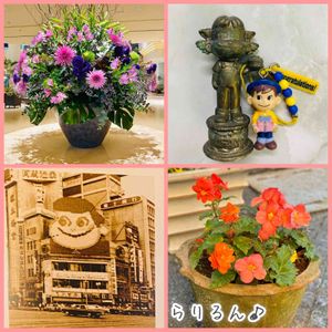 ペコちゃん祭り参加ですヾ(o´▽`)ノ ☀️.° 1周年だそうですね おめでとうございます🎊㊗ ↖️先日用事で出掛けた先のホテルのロビーにて 大きな生け花が飾られていました 真ん中のピンクは何かなぁ🌸 菊のスプレーマムが近いでしょうか 🤔 ↗️長年持っているもう青銅みたいになっちゃってる ペコちゃんとストラップポコちゃん ちょっと渋いね~😅 ↙️レストランで許可を得て撮った 約60年前の不二家銀座店💗 昔から ワクワクさせてくれてたのね~♪ ↘️お散歩先の可愛らしかったオレンジ色の ベゴニアかな🧡❤