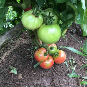 ●大玉トマト🍅(桃太郎) ジャングル化したマイ畑の雑草を少しだけ引きました 、、、、、すると、なんとなんと🤩🤩 大玉トマトが茎の下の方で色づき始めているではありませんか⁉️ 驚くことではありませぬが、、、(>人<;) ※拡大🈲🍅がちょっと、、、、