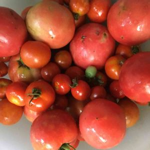 ●トマト🍅 今朝 家庭菜園で収穫 見た目は悪いけど味はバッチリです👌 トマトソースでも作ろうかな♪( ´▽`)