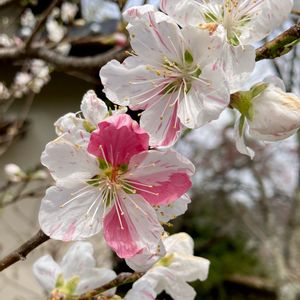 ハナモモ🌸 我が家の記念樹❤️ 阿智村であちこちに花桃が咲いてます。 昼神温泉周囲も満開です。🌸 花桃の里はまだ蕾が満載で、来週20日頃が見頃のようです。楽しみですねー❣️ 阿智村の花桃の特徴は白ピンク赤の花が 一本の木の中にある事です。