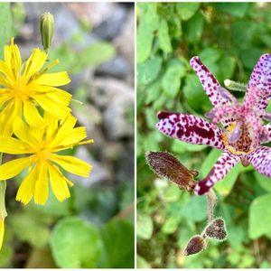 ヤクシソウ🌼 キク科オニタビラコ属 2年草 花が終わると首を垂れてしまい可愛い💕 別名 ウサギノチチ この名も可愛い😍 ホトトギス🌸 ユリ科ホトトギス属 多年草 やはりこの花が咲いて秋本番ですね🤗 うちの花は濃い紫の斑点が多くて暗いなぁ😅ちょっと残念!