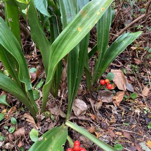 オモト(万年青) 昨日、田舎の家の庭を掃除していて枯葉の下で見つけた。ずっと何も手入れしてないのに赤い実をつけていて嬉しくなった🤗 キジカクシ科オモト属 日本原産 わが国独自の感性で改良されてきた 園芸植物