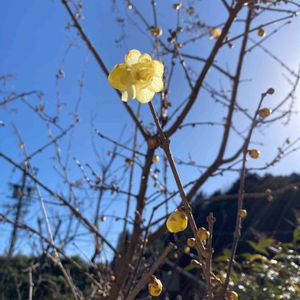 ソシンロウバイ🌼 昨日、青空の中咲いていました。🤗 今年は夜間の冷え込みが強く、開花が遅いです。蕾がたくさんあるので、これから香りを楽しめます🎶😍