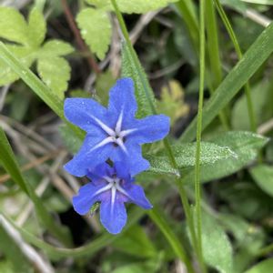 ホタルカズラ(蛍葛) ムラサキ科 ムラサキ属 4~6月 5~25cm 在来種 多年草 花径約15mm 花冠は鮮やかな青色~青紫色で、咲き始めは紅紫色 花冠の中心に向かって5本の白い隆起線が並び、星形に見える すっと立ち上がり、草むらから顔をのぞかせていた😌
