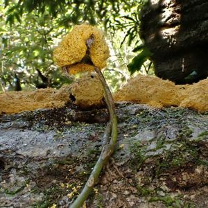長ーく垂れてるタレウツボホコリ…🤔? 昨日見つけた変形体がこんな立派な姿に🦠 イタモジホコリかな…🤔💭
