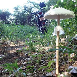 ご菌所ツーリング🏍 と言うよりバイクでの帰り道にマントカラカサタケ発見👀 マントにしてはまだまだ小さい子🍄🟫 いま全国各所でこのマントとかオオシロとかがにょきにょき出てるみたいね🤓