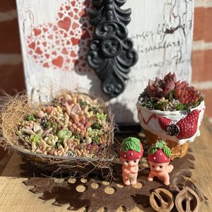 こんにちは〜😊🌤 エンジェル祭り👼✨ 2周年おめでとうございます〜🎉✨ *ଘ(੭*ˊᵕˋ)੭* ੈ✩︎‧₊˚ ほーちゃんのエンジェル鉢✨ 可愛いQPちゃん達にズッキュ〜ン💘💘💘 エンジェル祭りなので天使のリメ鉢少し手直ししました😊✨ 真ん中の鉢のピンクルルビーのような可愛い子❤️ 以前みどり☆ さんがアップされていた DAISO産の子‼️名札にはセデベリア❤️ セデベリア属みたいです。 私も見つけました〜😍✨ 寄せ植えにもいいサイズでなかなか可愛い〜💕 これはハマるよね😄 買い物ついでのDAISO日課になりそう🤣 どんどん増える富士の初雪(白雪)💚 富士の白雪が斑入りで、斑入り無しが初雪みたい。 下の方は緑だけど上の方に斑入りが見えてきた〜😃 これからの成長も楽しみ💚✨ かおりんさんのリメ缶のエンジェルティアーズ💚と 👼🐮QPちゃん達で 🏷エンジェル祭り 🏷錦の日 🏷牛の日 コラボ参加させてください〜💕 お手天使ちゃんに🐮ちゃんタッチ😄💕 今日もお祭り楽しみましょう〜♪︎♪︎(*´▽︎`*)ノ゙
