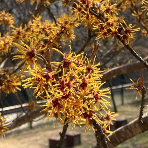 今、マンサク(万作)が満開です。 黄色い🟡独特の細長い花びらが特徴です🎶 葉🌿が出るよりも先に花が咲きます🌼 いち早く春の訪れを告げ、「まず咲く」の通りですね✨