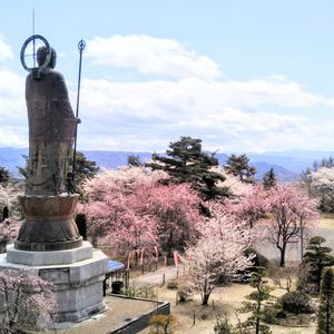 《 真楽寺 》 軽井沢から追分の先を、浅間サンラインに入り、しばらく走ると、桜と石楠花でも有名な真言宗の真楽寺が左手にあります 6世紀の浅間山大噴火の鎮火祈願として、586年に建立されています 高さ20mもある日本最大の子育て地蔵が、世の中の平和を見守っているように立っています🌈🙏 境内を飾る桜は、満開の姿を訪れる人々に惜しげなく魅せてくれました🎶 芭蕉の句碑があります むすぶより はや齒にひびく 清水かな 石碑の文字が不鮮明で ひびく、か、しみる、か 確かではありません