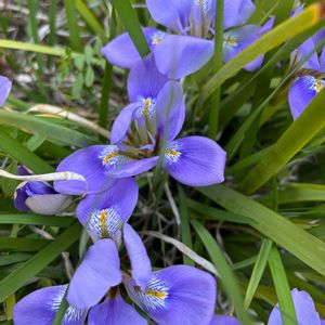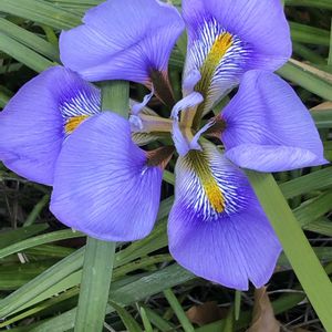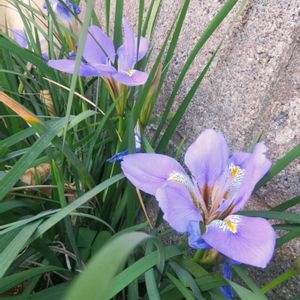 カンザキアヤメ(寒咲きアヤメ)が咲いていました。 別名カンアヤメ(寒菖蒲)、ウインターアイリスとも✨ アヤメ科の多年草で、外側の3枚の花弁と内側で直立した3枚の花弁があります💜 アヤメですから、基部の中央に黄色い🟨斑と網目状の模様があります🎶😃