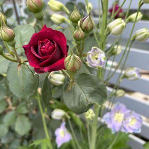 こんばんは⭐️ GWも明日まで 今日までかな。。 今日のばあばのお庭です ①オデュセイアとデルフィニウム デルフィニウムは草丈が150センチくらいになりました そんなに伸びるやなんて💦 ⓶クレマチスロウグチ ベルが大きくなって咲いてます ③河本ローズ ラブロッシュ3回目の春で 今年は沢山蕾をつけました とてもオシャレで好きな バラです ⓸昨年お迎えして初めて対面 クレマチス インスピレーション ベル型で咲き始め開きます 可愛いです ⑤ めちゃ人気なので 私もお迎えしました レイニーブルー 沢山の蕾つけてます 成長が楽しみやわぁ⤴️