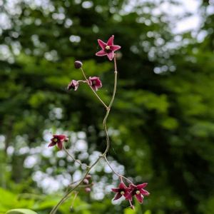 クサナギオゴケ(草薙尾苔) キョウチクトウ科 カモメヅル属 華やかではないけれど、里山の林縁斜面に咲く 佇まいは美しく~この地で静かに咲き続けてほしい お花デス ♡ 直立した茎の下部に、大きめの葉が対生して付いていて~茎先が伸びるにつれてつる状になるようです‥👀!! 茎先や上部の葉腋から針金のような花序を出して、 直径8㍉位の濃紫色の花をまばらにつけて咲いていました‥💜💚 花の構造は~フナバラソウ、スズサイコに似ています‥👌 ③ 花冠は星形 で5深裂、副花冠は環状で5裂、真ん中に雌しべがあって雄しべが筒状に合着した蕊柱(肉柱体)が見えています‥👀!! ✴ 日本固有種で、絶滅危惧種 愛知県瀬戸市(旧品野村)で 最初に発見され~ 尾張に関係深い熱田神宮の御神体の一つとなっている草薙ノ剣(くさなぎのつるぎ)に因み 「クサナギオゴケ(草薙尾苔)」と、名づけられたそう… オゴケは袋果が麻糸を積みためる容器 苧小笥(おごけ)に似ていることからだとか‥📝 ⑤ 雨上がりの里山はウグイス、ホトトギスが鳴き~畔にはキジが、スギの樹上にはオオヨシキリも。。。気持ちの良い散歩デシタ♡