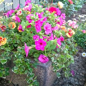 ミリオンベル プチホイップの寄せ植え。ピンク、マーマレードとフィカス プミラ。