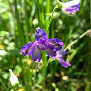 ①花壇の草の中でデルフィニウムが咲いていました❇️💟💙❇️ ②③カルーナ・ガーデンガールズ❇️🤍❇️ ④ゴーヤのお花❇️💛❇️ ⑤トレニア💜💙💟🤍