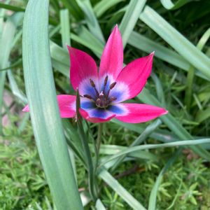 原種系ミニチューリップのリトルビューティー 3年前に白5個 赤5個植えて今はこの子が最後 結構頑張ってる♪ また見つけたら買ってこよ〜 ( ´ ▽ ` )/ 大きな葉っぱはアリウム ギガンチウム 抜かないと…