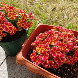 PW スーパーベル ホーリーフレア お花が咲きはじめています❁⃘*.゚ パキッとした赤×黄❤️💛 元気が出るカラーです 植え付けてから1ヶ月経ちました。 土が減ってきたように感じたので、この後、1度鉢から苗をだして土を足しました。 中途半端な根の張り方で、中々リスキーな作業でした💦 水やりし続けると土が締まってくるので、今後は土の量に気をつけようと思います。