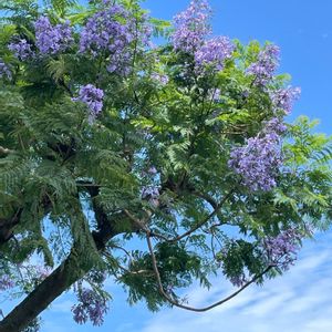 ジャカランダ(ノウゼンカズラ科キリモドキ属) 熱海のサンビーチの海岸沿いにジャカランダの花が満開です。 大きな木にたくさんのブルーのお花が咲いて、とっても綺麗です。 ジャカランダは南米産です。 カエンボク(火炎木)、ホウオウボク(鳳凰木)と並んでシウンボク(紫雲木)と呼ばれ、世界三大花木のひとつとされているジャカランダ。自生地では10mを超す高木になります。 花径5㎝くらいの釣鐘状の花を枝の先に塊のように咲かせるので、遠くから見ても存在感があります。ジャカランダの木は枝を横に広げる樹形なので、高木の枝いっぱいに青紫色の花をいっぱいに咲かせる姿は息を飲むほどの美しさです。