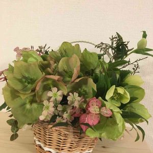 クリスマスローズが満開を過ぎ、種ができたのでおもいっきりばっさり! あまりに沢山なのでアレンジしてみました。 あり合わせの、庭の南天やら、羽衣ジャスミンを使って。