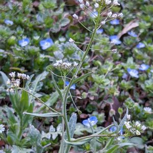 ナズナ、子供の頃からお馴染みのペンペン草。オオイヌノフグリの中あちこちに、いつの間にかナズナが伸びています。