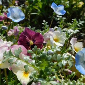 春の寄植え(完成形) 自家採種のビオラ こぼれ種のネモフィラ・プラチナスカイ こちらもようやく咲き揃いました プラチナスカイの青とシルバーがいい感じで溶け込んでいます