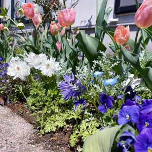 おはようございます(*^^*) 本日出勤😂 日祭日は夜勤が多いのでイレギュラーですが😥 昨日撮っておいた玄関西側花壇&寄せ植え チューリップ色づいてきました😊💕 浅い鉢にドーナツ状にパンビオを植え真ん中にチューリップ球根ギューギュー詰めに😆 右はパンジー オルキブルーシェイド 左はビオラ ヌーベルヴァーグとネモフィラ プラチナスカイ お花モリモリでオブジェのお家が埋もれています🤣💕 良い一日をお過ごしください🍀💗