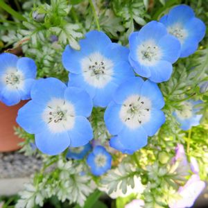 水曜日は水色~~🤗🥰💙😍💜シルバーリーフが特徴の、ネモフィラ・プラチナスカイ、プラチナラベンダー、プラチナスノー、3種類やっと咲きそろいました😊今年はちょっと生育が悪いけれど、なんとか3種一緒に咲いてくれて嬉しいです(*^▽^*)