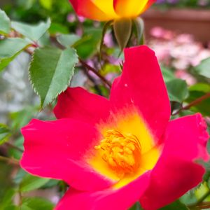 【カクテル】《バラ科》 花言葉 「愛」と「美」 ❤️赤 「あなたを愛します」「愛情」「美」 「情熱」「恋」「熱烈な恋」 真っ赤な一重咲きで、中心がくっきりとした黄色。 「カクテル」は、 色の対比が美しいつるバラです。 2022.4.27